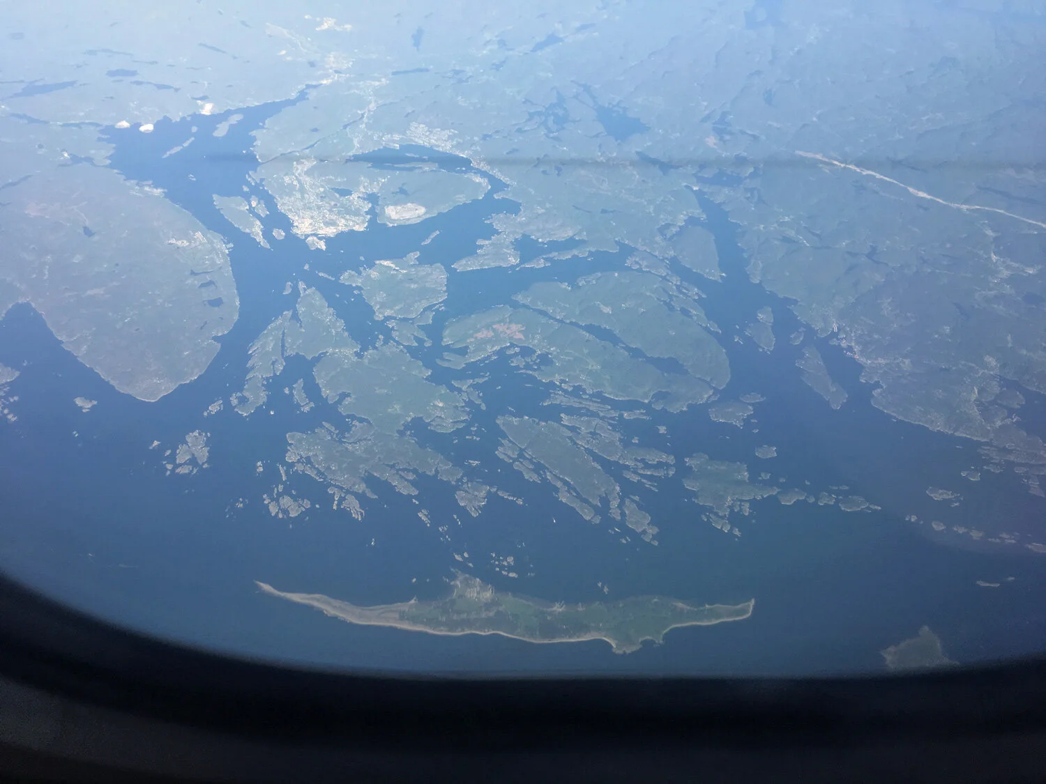 Jomfruland (nederst i bildet) sett fra flyvindu i 38 000 fots høyde. Kragerø ser du ovenfor midten av bildet.