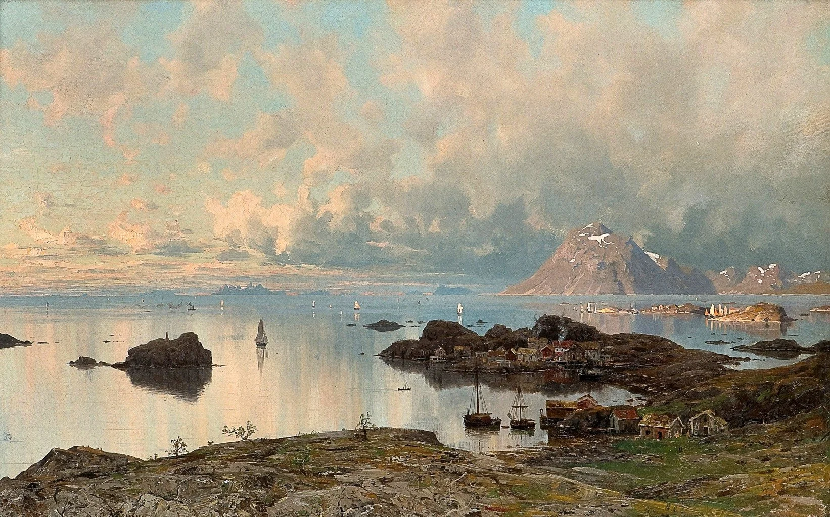 Adelsteen Normann - Fiskevær i Lofoten (Fishing village in Lofoten), oil on canvas, 60 x 97 cm. Public domain.